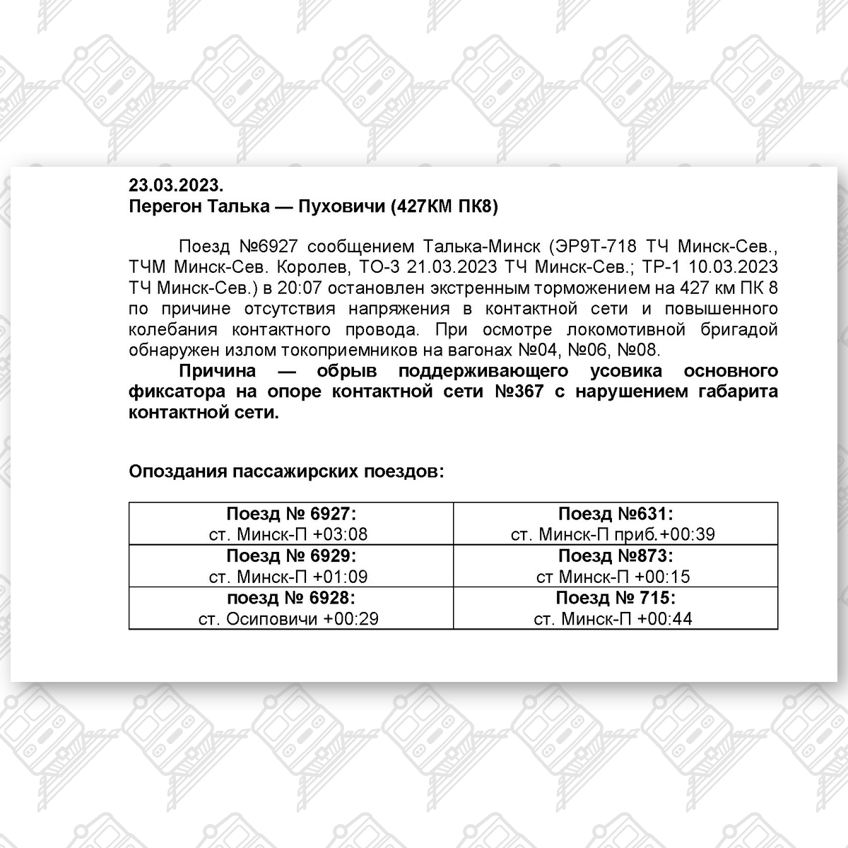 В сутки 23.03.2023 на перегоне Талька — Пуховичи (Минское отделение БЖД) при следовании поезда №6927 сообщением Талька — Минск локомотивной бригадой моторвагонного депо Минск было отмечено пропадание напряжения в контактной сети одновременно с колебаниями контактного провода. Машинист применил экстренное торможение. Поезд остановился в 20:07 на 427 км ПК 8.