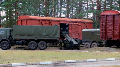 • 43 вагона-платформы (по информации @Hajun_BY, на вагонах-платформах были замечены: КШМ Р-149БМР «Кушетка-Б» и Р-149МА1, КамАЗы (кунг), тентованные Уралы, бензовозы Урал и полевой командный пункт АПЕ-5 (на базе шасси КамАЗ)).
