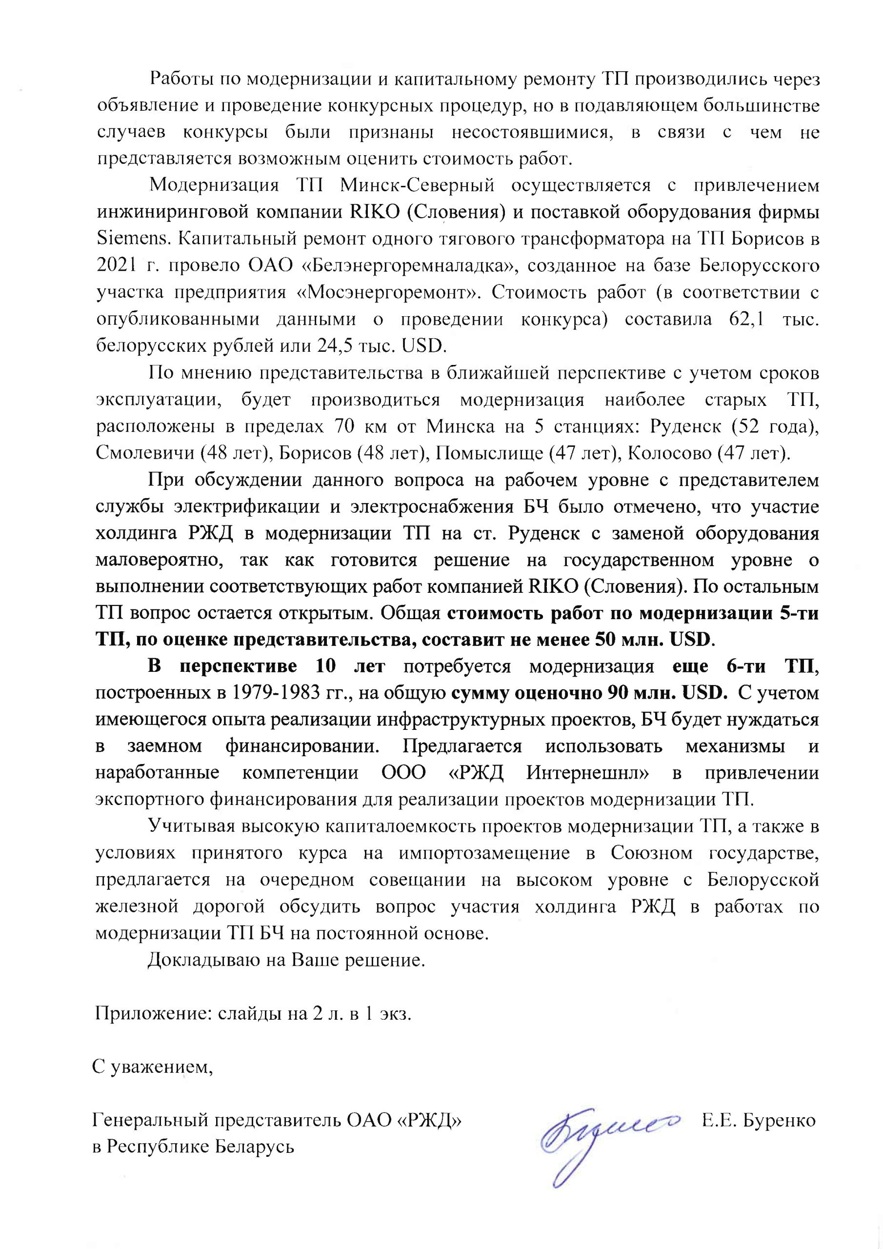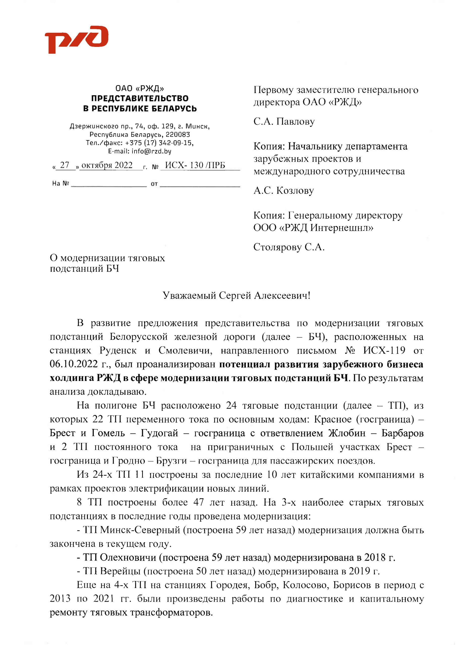 Письмо «О модернизации тяговых подстанций БЖД» от 27.10.2022 года: