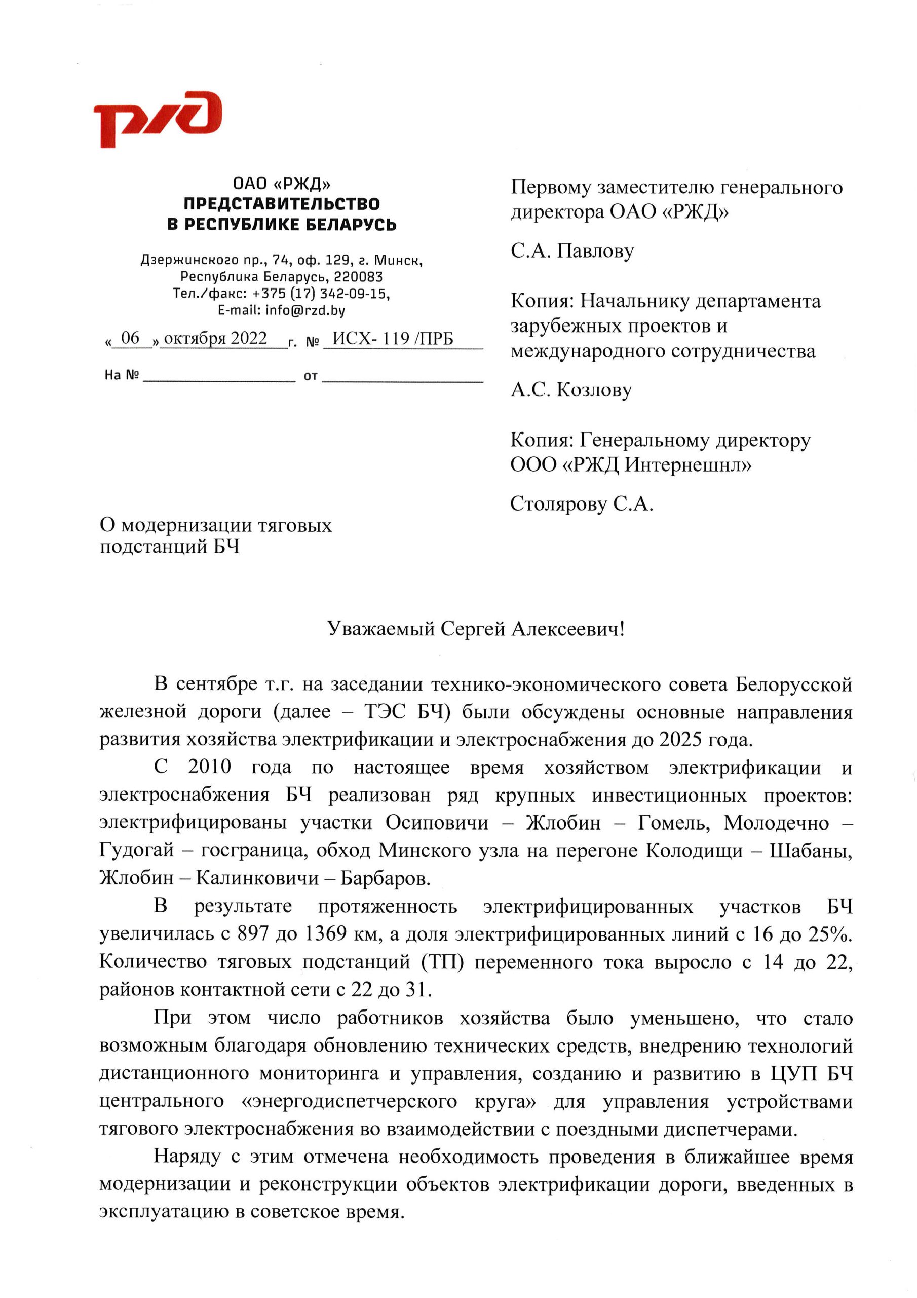 Письмо «О модернизации тяговых подстанций БЖД» от 06.10.2022 года: